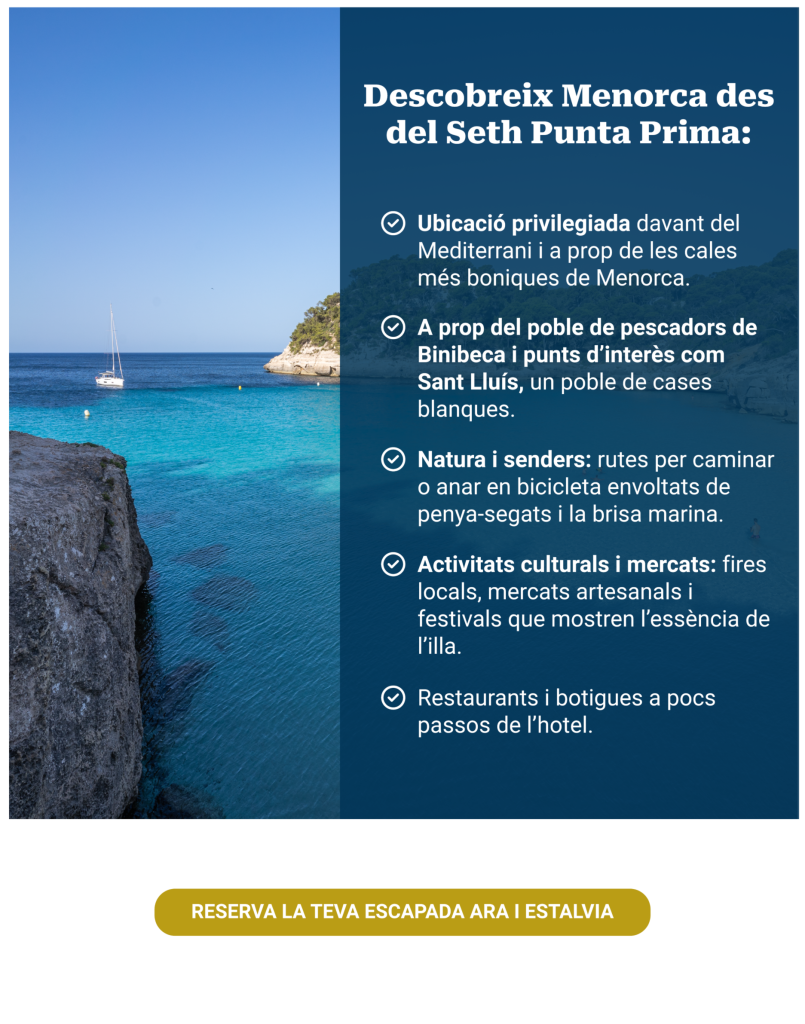 Al Seth Punta Prima podràs relaxar-te i gaudir de Menorca en tot el seu esplendor. Situat a la costa sud de l’illa, l’hotel és el punt de partida perfecte per descobrir Binibeca, Sant Lluís i altres racons amb encant.